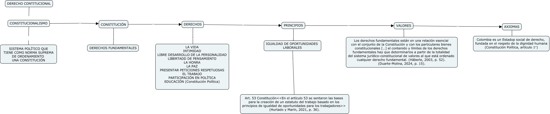 Este Cmap, tiene información relacionada con: Derecho Constitucional Presaberes, DERECHO CONTITUCIONAL CONSTITUCIONALISMO, CONSTITUCIÓN . DERECHOS, IGUALDAD DE OPORTUNIDADES LABORALES . Art. 53 Constitución<<En el artículo 53 se sentaron las bases para la creación de un estatuto del trabajo basado en los principios de igualdad de oportunidades para los trabajadores>> (Hurtado y Marín, 2021, p. 36)., CONSTITUCIÓN . DERECHOS FUNDAMENTALES, CONSTITUCIONALISMO . CONSTITUCIÓN, VALORES . AXIOMAS, VALORES . Los derechos fundamentales están en una relación esencial con el conjunto de la Constitución y con los particulares bienes constitucionales […] el contenido y límites de los derechos fundamentales hay que determinarlos a partir de la totalidad del sistema jurídico-constitucional de valores al que está ordenado cualquier derecho fundamental. (Häberle, 2003, p. 52). (Duarte-Molina, 2024, p. 15)., PRINCIPIOS . VALORES, PRINCIPIOS . IGUALDAD DE OPORTUNIDADES LABORALES, AXIOMAS . Colombia es un Estadop social de derecho, fundada en el respeto de la dignidad humana (Constitución Política, artículo 1°), DERECHOS . LA VIDA INTIMIDAD LIBRE DESARROLLO DE LA PERSONALIDAD LIBERTADD DE PENSAMIENTO LA HONRA LA PAZ PRESENTAR PETICIONES RESPETUOSAS EL TRABAJO PARTICIPACIÓN EN POLÍTICA EDUCACIÓN (Constitución Política), DERECHOS PRINCIPIOS, CONSTITUCIONALISMO SISTEMA POLÍTICO QUE TIENE COMO NORMA SUPREMA DE ORDENAMIENTO UNA CONSTITUCIÓN