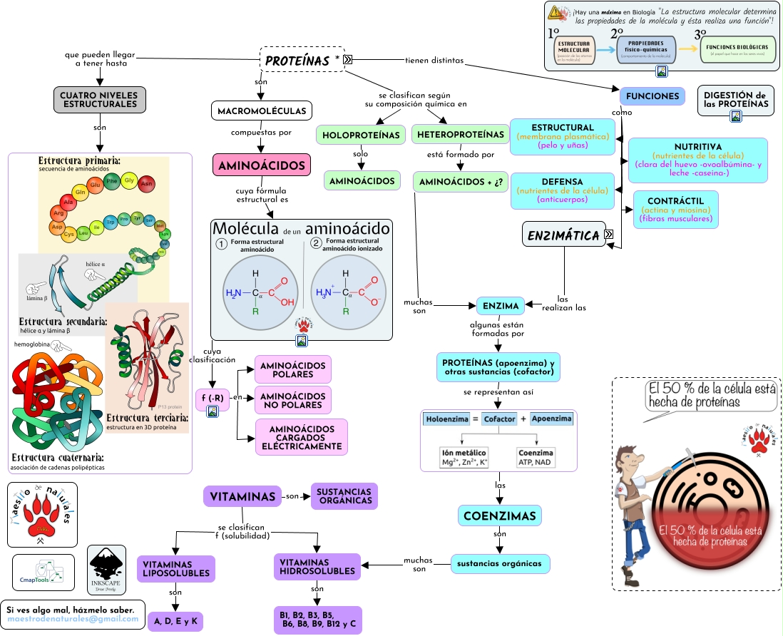 Este Cmap, tiene información relacionada con: Tema 03.02.03 Proteínas, PROTEÍNAS * son MACROMOLÉCULAS, FUNCIONES como ESTRUCTURAL (membrana plasmática) (pelo y uñas), CUATRO NIVELES ESTRUCTURALES son, VITAMINAS HIDROSOLUBLES son B1, B2, B3, B5, B6, B8, B9, B12 y C, PROTEÍNAS compuestas por los siguientes bioelementos CARBONO (C), PROTEÍNAS compuestas por los siguientes bioelementos NITRÓGENO (N), ENZIMÁTICA las realizan las ENZIMA, PROTEÍNAS * tienen distintas FUNCIONES, sustancias orgánicas muchas son VITAMINAS HIDROSOLUBLES, ENZIMA algunas están formadas por PROTEÍNAS (apoenzima) y otras sustancias (cofactor), FUNCIONES como ENZIMÁTICA, FUNCIONES como DEFENSA (nutrientes de la célula) (anticuerpos), las COENZIMAS, f (-R) en AMINOÁCIDOS NO POLARES, AZUFRE (S) en proporciones MUY BAJAS, PROTEÍNAS (apoenzima) y otras sustancias (cofactor) se representan así, VITAMINAS se clasifican f (solubilidad) VITAMINAS HIDROSOLUBLES, VITAMINAS se clasifican f (solubilidad) VITAMINAS LIPOSOLUBLES, PROTEÍNAS compuestas por los siguientes bioelementos AZUFRE (S), PROTEÍNAS compuestas por los siguientes bioelementos OXÍGENO (O)