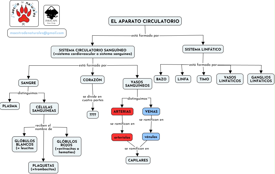 Este Cmap, tiene información relacionada con: 5.01.00 El aparato circulatorio, arteriolas se ramifican en CAPILARES, EL APARATO CIRCULATORIO está formado por SISTEMA LINFÁTICO, SISTEMA CIRCULATORIO SANGUÍNEO (=sistema cardiovascular o sistema sanguíneo) está formado por SANGRE, CÉLULAS SANGUÍNEAS reciben el nombre de GLÓBULOS ROJOS (=eritrocitos o hematíes), vénulas se ramifican en CAPILARES, ARTERIAS se ramifican en arteriolas, VASOS SANGUÍNEOS distinguimos VENAS, SISTEMA LINFÁTICO está formado por GANGLIOS LINFÁTICOS, SISTEMA LINFÁTICO está formado por VASOS LINFÁTICOS, SISTEMA LINFÁTICO está formado por LINFA, SISTEMA LINFÁTICO está formado por TIMO, VENAS se ramifican en vénulas, CÉLULAS SANGUÍNEAS reciben el nombre de GLÓBULOS BLANCOS (= leucitos, CORAZÓN se divide en cuatro partes ????, SANGRE distinguimos CÉLULAS SANGUÍNEAS, SISTEMA CIRCULATORIO SANGUÍNEO (=sistema cardiovascular o sistema sanguíneo) está formado por CORAZÓN, CÉLULAS SANGUÍNEAS reciben el nombre de PLAQUETAS (=trombocitos), SISTEMA LINFÁTICO está formado por BAZO, VASOS SANGUÍNEOS distinguimos ARTERIAS, EL APARATO CIRCULATORIO está formado por SISTEMA CIRCULATORIO SANGUÍNEO (=sistema cardiovascular o sistema sanguíneo)