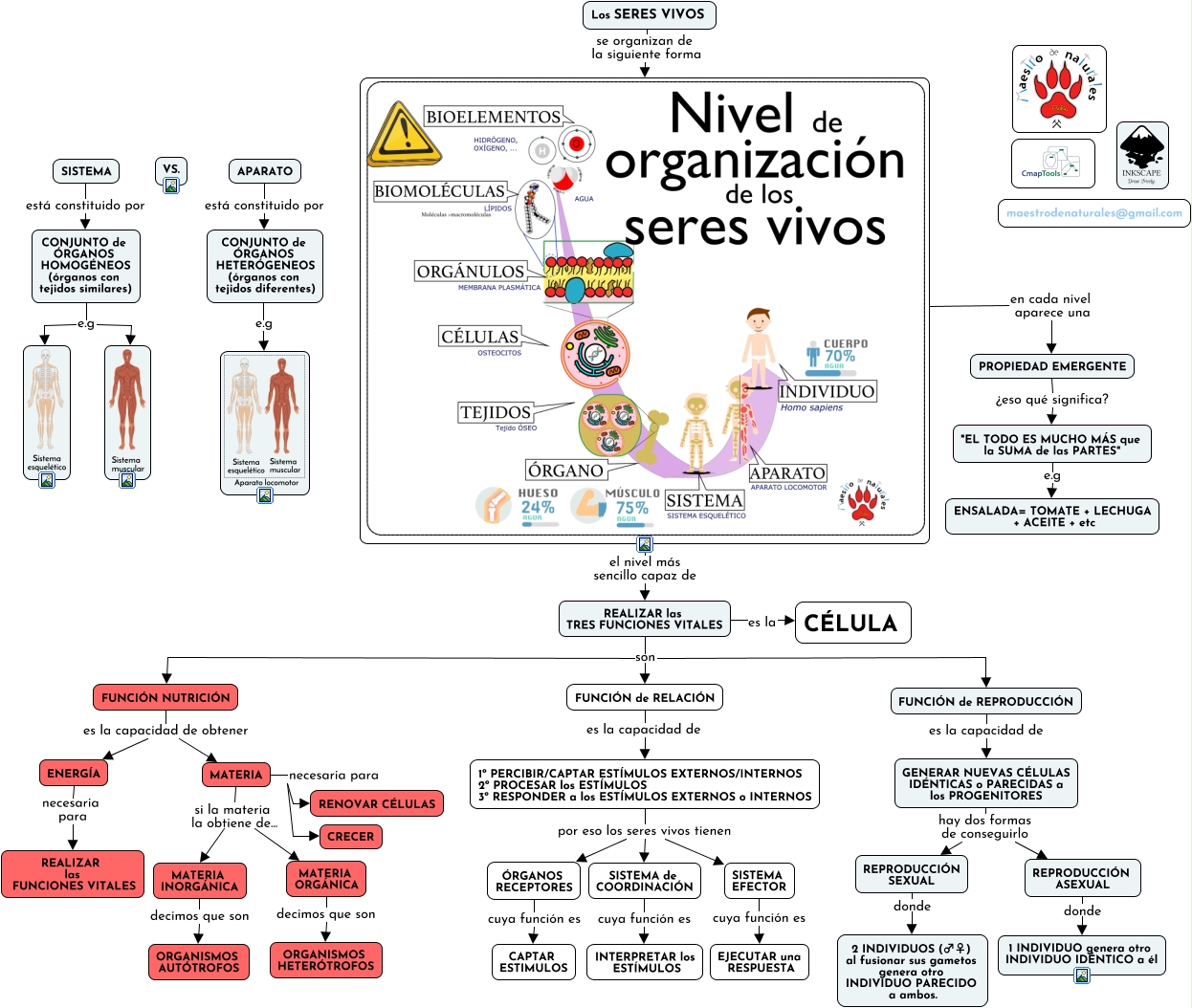 Este Cmap, tiene información relacionada con: Tema 03.01.00 La organización del ser humano, REALIZAR las TRES FUNCIONES VITALES son FUNCIÓN NUTRICIÓN, MATERIA INORGÁNICA decimos que son ORGANISMOS AUTÓTROFOS, MATERIA necesaria para CRECER, "EL TODO ES MUCHO MÁS que la SUMA de las PARTES" e.g ENSALADA= TOMATE + LECHUGA + ACEITE + etc, FUNCIÓN de RELACIÓN es la capacidad de 1º PERCIBIR/CAPTAR ESTÍMULOS EXTERNOS/INTERNOS 2º PROCESAR los ESTÍMULOS 3º RESPONDER a los ESTÍMULOS EXTERNOS o INTERNOS, SISTEMA de COORDINACIÓN cuya función es INTERPRETAR los ESTÍMULOS, REPRODUCCIÓN ASEXUAL donde 1 INDIVIDUO genera otro INDIVIDUO IDÉNTICO a él, PROPIEDAD EMERGENTE ¿eso qué significa? "EL TODO ES MUCHO MÁS que la SUMA de las PARTES", en cada nivel aparece una PROPIEDAD EMERGENTE, GENERAR NUEVAS CÉLULAS IDÉNTICAS o PARECIDAS a los PROGENITORES hay dos formas de conseguirlo REPRODUCCIÓN SEXUAL, REPRODUCCIÓN SEXUAL donde 2 INDIVIDUOS (♂♀) al fusionar sus gametos genera otro INDIVIDUO PARECIDO a ambos., SISTEMA EFECTOR cuya función es EJECUTAR una RESPUESTA, Los SERES VIVOS se organizan de la siguiente forma, MATERIA necesaria para RENOVAR CÉLULAS, SISTEMA está constituido por CONJUNTO de ÓRGANOS HOMOGÉNEOS (órganos con tejidos similares), CONJUNTO de ÓRGANOS HOMOGÉNEOS (órganos con tejidos similares) e.g, REALIZAR las TRES FUNCIONES VITALES es la CÉLULA, CONJUNTO de ÓRGANOS HOMOGÉNEOS (órganos con tejidos similares) e.g, GENERAR NUEVAS CÉLULAS IDÉNTICAS o PARECIDAS a los PROGENITORES hay dos formas de conseguirlo REPRODUCCIÓN ASEXUAL, MATERIA si la materia la obtiene de... MATERIA ORGÁNICA