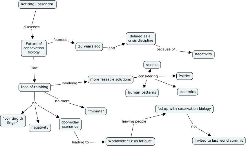 retiring cassandra, Idea of thinking no "pointing th finger", Retiring Cassandra discusses Future of consevation biology, more feasable solutions considering Politics, 20 years ago and defined as a crisis discipline, doomsday scenarios leading to Worldwide "Crisis fatigue", Future of consevation biology founded 20 years ago, more feasable solutions considering science, Idea of thinking no more "minima", defined as a crisis discipline because of negativity, more feasable solutions considering human patterns
