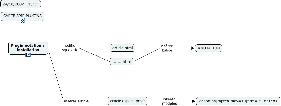 This Concept Map has information related to: instal notations, article.html insérer balise #NOTATION, article espace privé insérer modèles <notation|topten|max=10|titre=le TopTen>, Plugin notation : installation insérer article article espace privé, Plugin notation : installation modifier squelette ........html, ........html insérer balise #NOTATION, Plugin notation : installation modifier squelette article.html