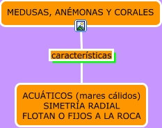 Este mapa conceptual tiene información relacionada a: medusa, anemonas, corales, MEDUSAS, ANÉMONAS Y CORALES características ACUÁTICOS (mares cálidos) SIMETRÍA RADIAL FLOTAN O FIJOS A LA ROCA