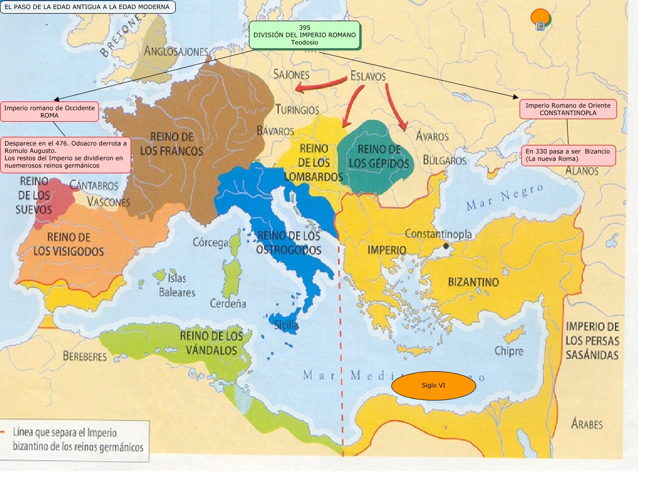 Este Cmap, tiene información relacionada con: IMPERIO BIZANTINO, 395 DIVISIÓN DEL IMPERIO ROMANO Teodosio ???? Imperio Romano de Oriente CONSTANTINOPLA, 395 DIVISIÓN DEL IMPERIO ROMANO Teodosio ???? Imperio romano de Occidente ROMA, Imperio romano de Occidente ROMA ???? Desparece en el 476. Odoacro derrota a Romulo Augusto. Los restos del Imperio se dividieron en nuemerosos reinos germánicos, Imperio Romano de Oriente CONSTANTINOPLA ???? En 330 pasa a ser Bizancio (La nueva Roma)