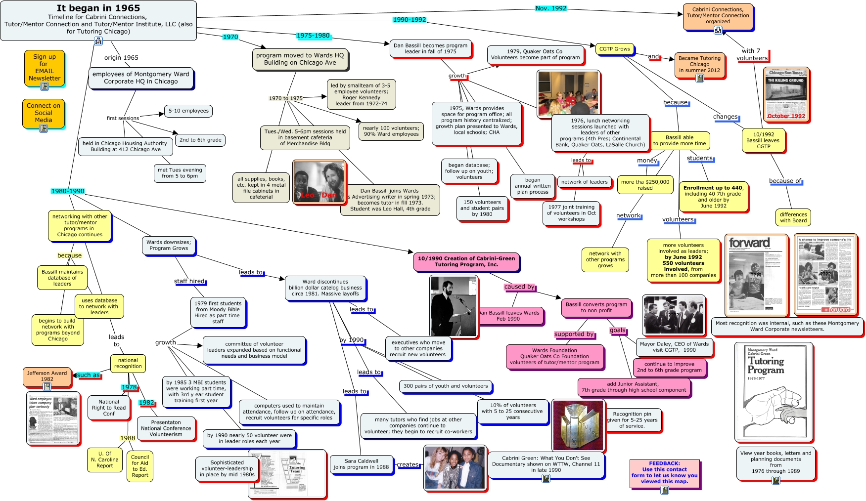 This Concept Map, created with IHMC CmapTools, has information related to: timeline 1965 to 1992, Dan Bassill becomes program leader in fall of 1975 growth 150 volunteers and student pairs by 1980, national recognition 1982 Presentaton National Conference Volunteerism, Ward discontinues billion dollar catelog business circa 1981. Massive layoffs by 1990 10% of volunteers with 5 to 25 consecutive years, networking with other tutor/mentor programs in Chicago continues because uses database to network with leaders, 10/1990 Creation of Cabrini-Green Tutoring Program, Inc. caused by Bassill converts program to non profit, Bassill able to provide more time money more tha $250,000 raised, It began in 1965 Timeline for Cabrini Connections, Tutor/Mentor Connection and Tutor/Mentor Institute, LLC (also for Tutoring Chicago) Nov. 1992 Cabrini Connections, Tutor/Mentor Connection organized, Bassill converts program to non profit goals add Junior Assistant, 7th grade through high school component, networking with other tutor/mentor programs in Chicago continues leads to national recognition, 1976, lunch networking sessions launched with leaders of other programs (4th Pres; Continental Bank, Quaker Oats, LaSalle Church) leads to network of leaders, Ward discontinues billion dollar catelog business circa 1981. Massive layoffs leads to executives who move to other companies recruit new volunteers, It began in 1965 Timeline for Cabrini Connections, Tutor/Mentor Connection and Tutor/Mentor Institute, LLC (also for Tutoring Chicago) 1990-1992 CGTP Grows, Dan Bassill becomes program leader in fall of 1975 growth began annual written plan process, national recognition 1988 U. Of N. Carolina Report, networking with other tutor/mentor programs in Chicago continues because Bassill maintains database of leaders, Dan Bassill becomes program leader in fall of 1975 growth 1975, Wards provides space for program office; all program history centralized; growth plan presented to Wards, local schools; CHA, program moved to Wards HQ Building on Chicago Ave 1970 to 1975 Dan Bassill joins Wards as Advertising writer in spring 1973; becomes tutor in flll 1973. Student was Leo Hall, 4th grade, national recognition 1988 Council for Aid to Ed. Report, 10/1992 Bassill leaves CGTP because of differences with Board, Bassill able to provide more time students Enrollment up to 440, including 40 7th grade and older by June 1992
