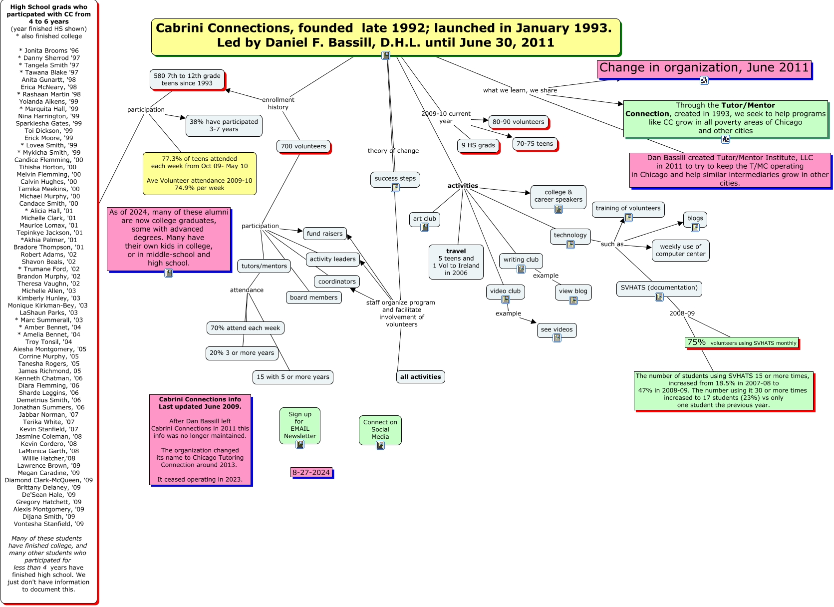 This Concept Map, created with IHMC CmapTools, has information related to: metrics for Cabrini Connections, 700 volunteers participation board members, technology such as SVHATS (documentation), 700 volunteers participation coordinators, tutors/mentors attendance 15 with 5 or more years, Cabrini Connections, founded late 1992; launched in January 1993. Led by Daniel F. Bassill, D.H.L. until June 30, 2011 activities writing club, Cabrini Connections, founded late 1992; launched in January 1993. Led by Daniel F. Bassill, D.H.L. until June 30, 2011 activities travel 5 teens and 1 Vol to Ireland in 2006, technology such as blogs, tutors/mentors attendance 70% attend each week, Cabrini Connections, founded late 1992; launched in January 1993. Led by Daniel F. Bassill, D.H.L. until June 30, 2011 activities art club, 580 7th to 12th grade teens since 1993 participation High School grads who particpated with CC from 4 to 6 years (year finished HS shown) * also finished college * Jonita Brooms '96 * Danny Sherrod '97 * Tangela Smith '97 * Tawana Blake '97 Anita Gunartt, '98 Erica McNeary, '98 * Rashaan Martin '98 Yolanda Aikens, '99 * Marquita Hall, '99 Nina Harrington, '99 Sparkiesha Gates, '99 Toi Dickson, '99 Erick Moore, '99 * Lovea Smith, '99 * Mykicha Smith, '99 Candice Flemming, '00 Tihisha Horton, '00 Melvin Flemming, '00 Calvin Hughes, '00 Tamika Meekins, '00 Michael Murphy, '00 Candace Smith, '00 * Alicia Hall, '01 Michelle Clark, '01 Maurice Lomax, '01 Tepinkye Jackson, '01 *Akhia Palmer, '01 Bradore Thompson, '01 Robert Adams, '02 Shavon Beals, '02 * Trumane Ford, '02 Brandon Murphy, '02 Theresa Vaughn, '02 Michelle Allen, '03 Kimberly Hunley, '03 Monique Kirkman-Bey, '03 LaShaun Parks, '03 * Marc Summerall, '03 * Amber Bennet, '04 * Amelia Bennet, '04 Troy Tonsil, '04 Aiesha Montgomery, '05 Corrine Murphy, '05 Tanesha Rogers, '05 James Richmond, 05 Kenneth Chatman, '06 Diara Flemming, '06 Sharde Leggins, '06 Demetrius Smith, '06 Jonathan Summers, '06 Jabbar Norman, '07 Terika White, '07 Kevin Stanfield, '07 Jasmine Coleman, '08 Kevin Cordero, '08 LaMonica Garth, '08 Willie Hatcher,'08 Lawrence Brown, '09 Megan Caradine, '09 Diamond Clark-McQueen, '09 Brittany Delaney, '09 De'Sean Hale, '09 Gregory Hatchett, '09 Alexis Montgomery, '09 Dijana Smith, '09 Vontesha Stanfield, '09 Many of these students have finished college, and many other students who participated for less than 4 years have finished high school. We just don't have information to document this., Cabrini Connections, founded late 1992; launched in January 1993. Led by Daniel F. Bassill, D.H.L. until June 30, 2011 staff organize program and facilitate involvement of volunteers coordinators, Cabrini Connections, founded late 1992; launched in January 1993. Led by Daniel F. Bassill, D.H.L. until June 30, 2011 2009-10 current year 70-75 teens, Cabrini Connections, founded late 1992; launched in January 1993. Led by Daniel F. Bassill, D.H.L. until June 30, 2011 activities technology, 580 7th to 12th grade teens since 1993 participation 38% have participated 3-7 years, 700 volunteers participation activity leaders, 700 volunteers participation tutors/mentors, Cabrini Connections, founded late 1992; launched in January 1993. Led by Daniel F. Bassill, D.H.L. until June 30, 2011 what we learn, we share Change in organization, June 2011, video club example see videos, writing club example view blog, Cabrini Connections, founded late 1992; launched in January 1993. Led by Daniel F. Bassill, D.H.L. until June 30, 2011 what we learn, we share Dan Bassill created Tutor/Mentor Institute, LLC in 2011 to try to keep the T/MC operating in Chicago and help similar intermediaries grow in other cities.