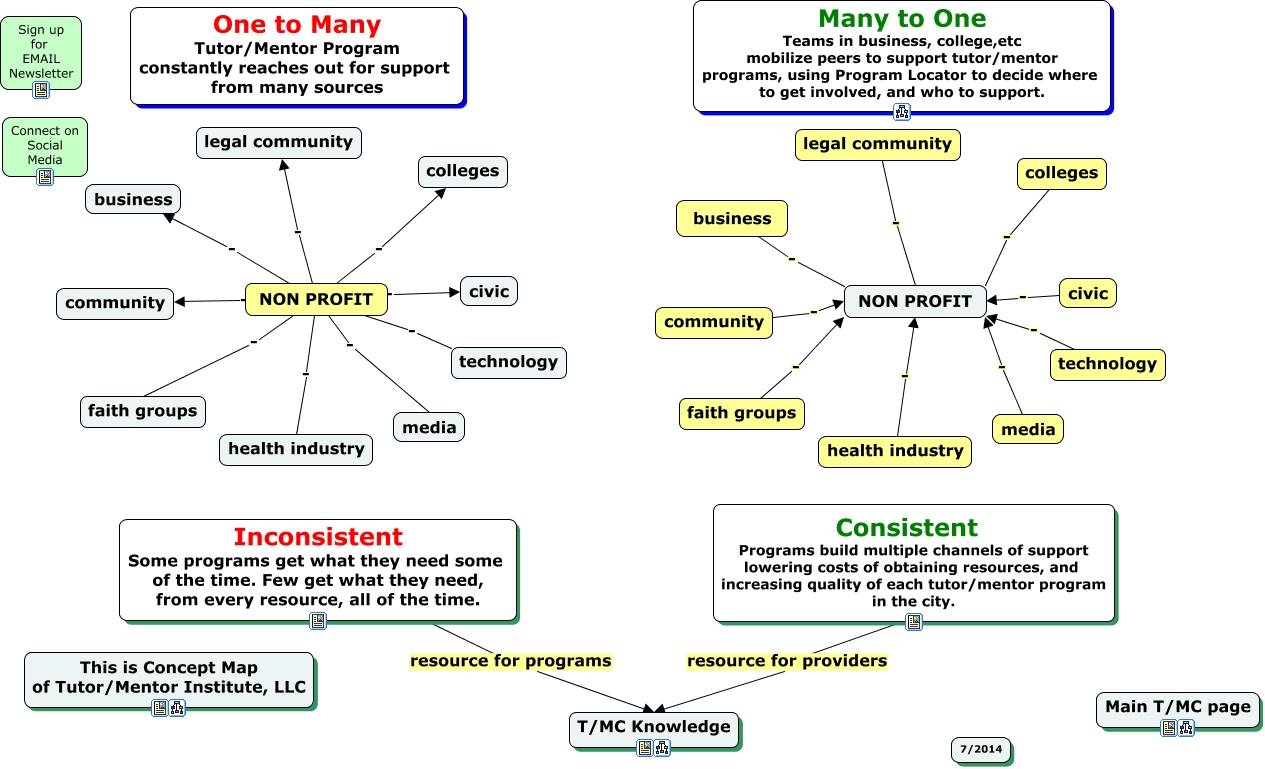 This Concept Map, created with IHMC CmapTools, has information related to: many to one strategy, NON PROFIT - colleges, NON PROFIT - business, legal community - NON PROFIT, civic - NON PROFIT, Consistent Programs build multiple channels of support lowering costs of obtaining resources, and increasing quality of each tutor/mentor program in the city. resource for providers T/MC Knowledge, NON PROFIT - legal community, faith groups - NON PROFIT, NON PROFIT - faith groups, Inconsistent Some programs get what they need some of the time. Few get what they need, from every resource, all of the time. resource for programs T/MC Knowledge, NON PROFIT - media, NON PROFIT - technology, community - NON PROFIT, NON PROFIT - community, health industry - NON PROFIT, NON PROFIT - civic, technology - NON PROFIT, colleges - NON PROFIT, NON PROFIT - health industry, media - NON PROFIT, business - NON PROFIT