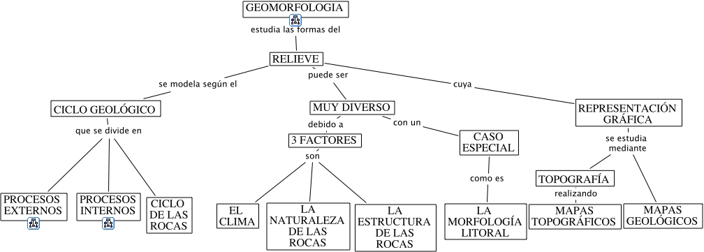 This Concept Map, created with IHMC CmapTools, has information related to: geomorfologia, MUY DIVERSO debido a 3 FACTORES, RELIEVE se modela según el CICLO GEOLÓGICO, 3 FACTORES son EL CLIMA, CICLO GEOLÓGICO que se divide en PROCESOS INTERNOS, RELIEVE puede ser MUY DIVERSO, CICLO GEOLÓGICO que se divide en CICLO DE LAS ROCAS, 3 FACTORES son LA ESTRUCTURA DE LAS ROCAS, REPRESENTACIÓN GRÁFICA se estudia mediante MAPAS GEOLÓGICOS, REPRESENTACIÓN GRÁFICA se estudia mediante TOPOGRAFÍA, MUY DIVERSO con un CASO ESPECIAL, GEOMORFOLOGIA estudia las formas del RELIEVE, RELIEVE cuya REPRESENTACIÓN GRÁFICA, 3 FACTORES son LA NATURALEZA DE LAS ROCAS, CASO ESPECIAL como es LA MORFOLOGÍA LITORAL, CICLO GEOLÓGICO que se divide en PROCESOS EXTERNOS, TOPOGRAFÍA realizando MAPAS TOPOGRÁFICOS