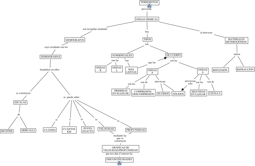This Concept Map, created with IHMC CmapTools, has information related to: terremotos, SUPERFICIALES son MÁS LENTAS, ONDAS P atraviesan FLUIDOS, VELOCIDAD mediante las que se construyen GRÁFICAS DE VELOCIDAD/PROFUNDIDAD, se puede saber la PROFUNDIDAD, GRÁFICAS DE VELOCIDAD/PROFUNDIDAD que nos dan a conocer las DISCONTINUIDADES, ESCALAS de RICHTER, ONDAS S atraviesan sólo SÓLIDOS, SISMOGRAMAS basándose en ellos se puede saber, ONDAS SÍSMICAS al atravesar MATERIALES HETEROGÉNEOS, se puede saber a CUÁNTOS KM, SUPERFICIALES son las ONDAS L, se puede saber la VELOCIDAD, TERREMOTOS provocan ONDAS SÍSMICAS, PROFUNDIDAD mediante las que se construyen GRÁFICAS DE VELOCIDAD/PROFUNDIDAD, MATERIALES HETEROGÉNEOS sufren REFLEXIÓN, SISMOGRAMAS basándose en ellos ESCALAS, se puede saber el CUÁNDO, SISMÓGRAFOS cuyo resultado son los SISMOGRAMAS, TIPOS son DE CUERPO, ONDAS SÍSMICAS hay TIPOS