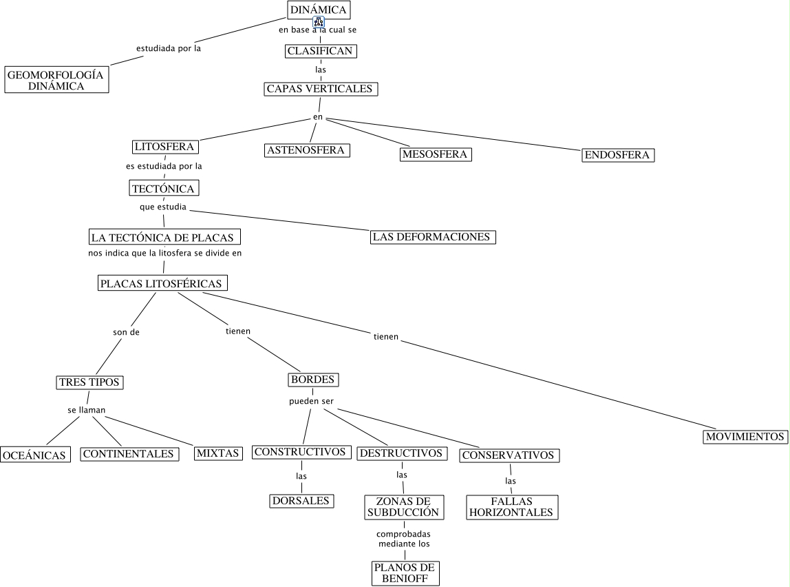 This Concept Map, created with IHMC CmapTools, has information related to: dinamica, BORDES pueden ser DESTRUCTIVOS, PLACAS LITOSFÉRICAS son de TRES TIPOS, PLACAS LITOSFÉRICAS tienen BORDES, CONSERVATIVOS las FALLAS HORIZONTALES, TRES TIPOS se llaman CONTINENTALES, LITOSFERA es estudiada por la TECTÓNICA, CONSTRUCTIVOS las DORSALES, LA TECTÓNICA DE PLACAS nos indica que la litosfera se divide en PLACAS LITOSFÉRICAS, TRES TIPOS se llaman MIXTAS, ZONAS DE SUBDUCCIÓN comprobadas mediante los PLANOS DE BENIOFF, BORDES pueden ser CONSERVATIVOS, CAPAS VERTICALES en LITOSFERA, TECTÓNICA que estudia LAS DEFORMACIONES, TECTÓNICA que estudia LA TECTÓNICA DE PLACAS, PLACAS LITOSFÉRICAS tienen MOVIMIENTOS, CAPAS VERTICALES en MESOSFERA, DESTRUCTIVOS las ZONAS DE SUBDUCCIÓN, TRES TIPOS se llaman OCEÁNICAS, DINÁMICA estudiada por la GEOMORFOLOGÍA DINÁMICA, DINÁMICA en base a la cual se CLASIFICAN