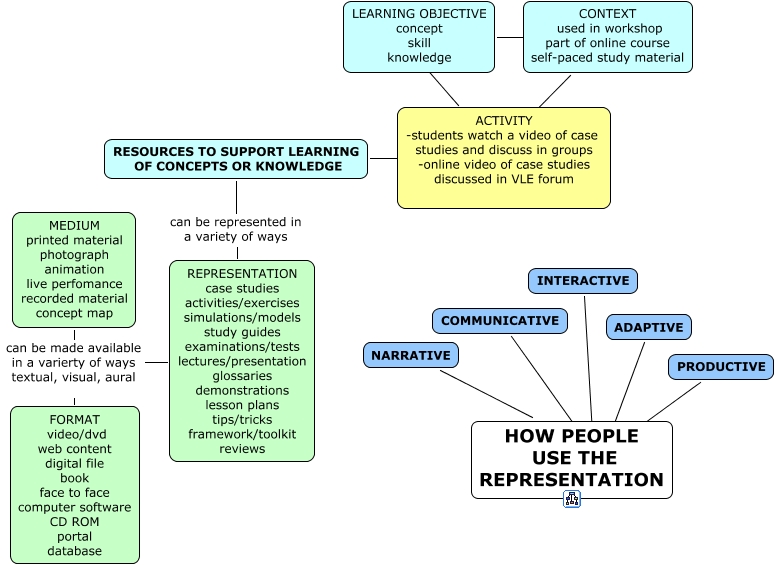 This Concept Map, created with IHMC CmapTools, has information related to: model, ACTIVITY -students watch a video of case studies and discuss in groups -online video of case studies discussed in VLE forum ???? RESOURCES TO SUPPORT LEARNING OF CONCEPTS OR KNOWLEDGE, RESOURCES TO SUPPORT LEARNING OF CONCEPTS OR KNOWLEDGE can be represented in a variety of ways REPRESENTATION case studies activities/exercises simulations/models study guides examinations/tests lectures/presentation glossaries demonstrations lesson plans tips/tricks framework/toolkit reviews, MEDIUM printed material photograph animation live perfomance recorded material concept map can be made available in a varierty of ways textual, visual, aural REPRESENTATION case studies activities/exercises simulations/models study guides examinations/tests lectures/presentation glossaries demonstrations lesson plans tips/tricks framework/toolkit reviews, HOW PEOPLE USE THE REPRESENTATION ???? ADAPTIVE, ACTIVITY -students watch a video of case studies and discuss in groups -online video of case studies discussed in VLE forum ???? LEARNING OBJECTIVE concept skill knowledge, HOW PEOPLE USE THE REPRESENTATION ???? PRODUCTIVE, CONTEXT used in workshop part of online course self-paced study material ???? ACTIVITY -students watch a video of case studies and discuss in groups -online video of case studies discussed in VLE forum, HOW PEOPLE USE THE REPRESENTATION ???? INTERACTIVE, HOW PEOPLE USE THE REPRESENTATION ???? COMMUNICATIVE, HOW PEOPLE USE THE REPRESENTATION ???? NARRATIVE, FORMAT video/dvd web content digital file book face to face computer software CD ROM portal database MEDIUM printed material photograph animation live perfomance recorded material concept map, CONTEXT used in workshop part of online course self-paced study material ???? LEARNING OBJECTIVE concept skill knowledge