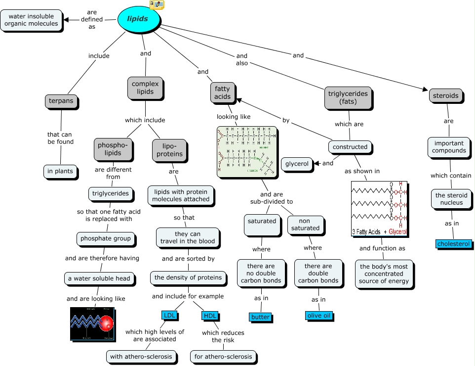 This Concept Map has information related to: lipids, constructed by fatty acids, lipids include terpans, the density of proteins and include for example LDL, a water soluble head and are looking like , triglycerides so that one fatty acid is replaced with phosphate group, fatty acids looking like , HDL which reduces the risk for athero-sclerosis, important compounds which contain the steroid nucleus, there are no double carbon bonds as in butter, lipids and steroids