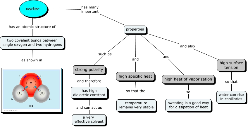 Este mapa conceptual tiene información relacionada a: water, properties and high heat of vaporization, high specific heat so that the temperature remains very stable, water has an atomic structure of two covalent bonds between single oxygen and two hydrogens, strong polarity and therefore has high dielectric constant, high heat of vaporization so sweating is a good way for dissipation of heat, properties and high specific heat, properties such as strong polarity, has high dielectric constant and can act as a very effective solvent, water has many important properties, properties and also high surface tension