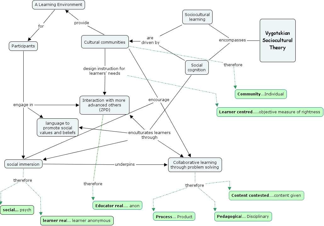 vygotsky, Social cognition enculturates learners through Collaborative learning through problem solving, Social cognition enculturates learners through Interaction with more advanced others (ZPD), Participants engage in language to promote social values and beliefs, social immersion therefore social... psych, A Learning Environment for Participants, social immersion underpins Collaborative learning through problem solving, Vygotskian Sociocultural Theory encompasses Sociocultural learning, Collaborative learning through problem solving therefore Content contested....content given, Collaborative learning through problem solving therefore Process... Product, social immersion therefore learner real... learner anonymous