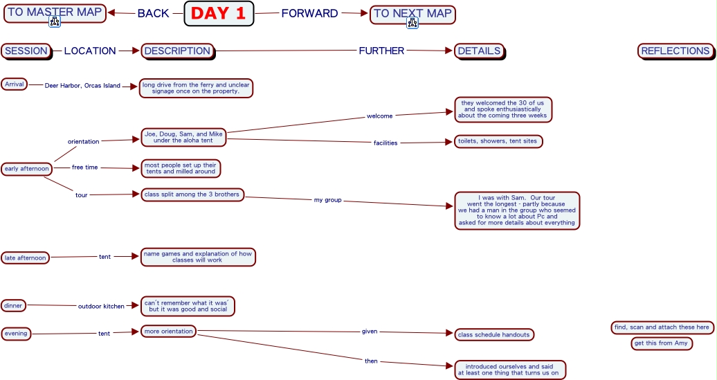This Concept Map, created with IHMC CmapTools, has information related to: PDC Bullock Day 1, Joe, Doug, Sam, and Mike under the aloha tent welcome they welcomed the 30 of us and spoke enthusiastically about the coming three weeks, more orientation given class schedule handouts, Joe, Doug, Sam, and Mike under the aloha tent facilities toilets, showers, tent sites, class split among the 3 brothers my group I was with Sam. Our tour went the longest - partly because we had a man in the group who seemed to know a lot about Pc and asked for more details about everything, SESSION LOCATION DESCRIPTION, evening tent more orientation, Arrival Deer Harbor, Orcas Island long drive from the ferry and unclear signage once on the property., DAY 1 FORWARD TO NEXT MAP, early afternoon orientation Joe, Doug, Sam, and Mike under the aloha tent, early afternoon tour class split among the 3 brothers, DAY 1 BACK TO MASTER MAP, dinner outdoor kitchen can't remember what it was' but it was good and social, DESCRIPTION FURTHER DETAILS, late afternoon tent name games and explanation of how classes will work, more orientation then introduced ourselves and said at least one thing that turns us on, early afternoon free time most people set up their tents and milled around