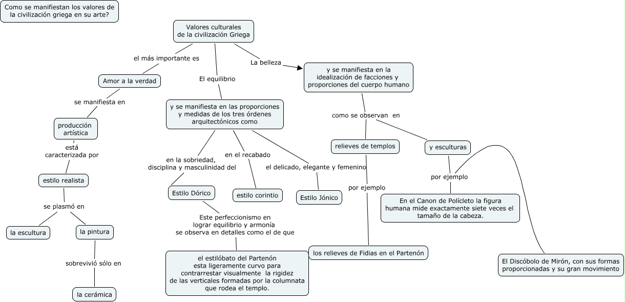 Arte Griego-revisado, Valores culturales de la civilización Griega el más importante es Amor a la verdad, y se manifiesta en la idealización de facciones y proporciones del cuerpo humano como se observan en relieves de templos, y se manifiesta en la idealización de facciones y proporciones del cuerpo humano como se observan en y esculturas, y esculturas por ejemplo El Discóbolo de Mirón, con sus formas proporcionadas y su gran movimiento, la pintura sobrevivió sólo en la cerámica, y se manifiesta en las proporciones y medidas de los tres órdenes arquitectónicos como el delicado, elegante y femenino Estilo Jónico, relieves de templos por ejemplo los relieves de Fidias en el Partenón, Estilo Dórico Este perfeccionismo en lograr equilibrio y armonía se observa en detalles como el de que el estilóbato del Partenón esta ligeramente curvo para contrarrestar visualmente la rigidez de las verticales formadas por la columnata que rodea el templo., producción artística está caracterizada por estilo realista, estilo realista se plasmó en la escultura