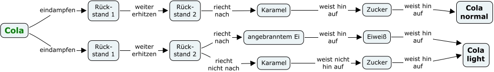 erste Unterscheidung, Rück- stand 2 riecht nach Karamel, Zucker weist hin auf Cola normal, Rück- stand 2 riecht nach angebranntem Ei, angebranntem Ei weist hin auf Eiweiß, Karamel weist nicht hin auf Zucker, Rück- stand 1 weiter erhitzen Rück- stand 2, Rück- stand 1 weiter erhitzen Rück- stand 2, Eiweiß weist hin auf Cola light, Cola eindampfen Rück- stand 1, Rück- stand 2 riecht nicht nach Karamel