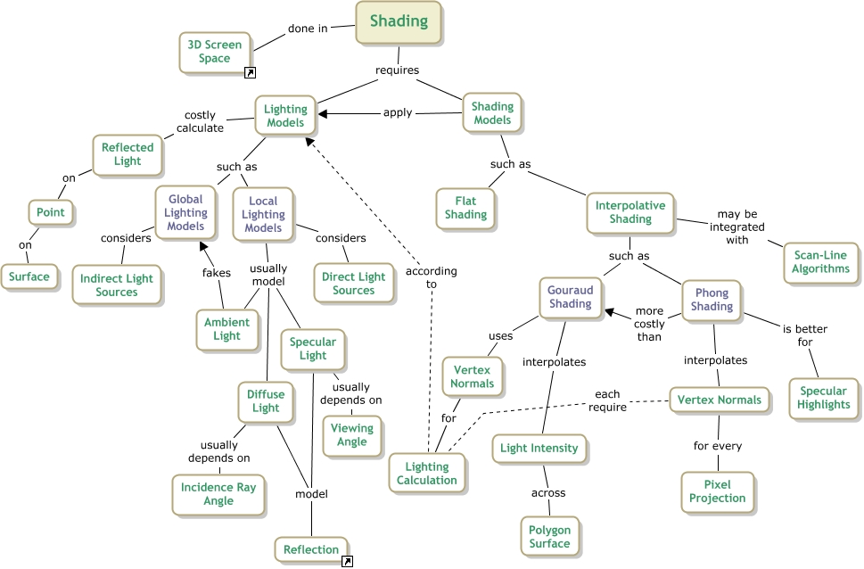 2006-03-16 Shading, Ambient Light fakes Global Lighting Models, Phong Shading is better for Specular Highlights, Shading Models apply Lighting Models, Diffuse Light usually depends on Incidence Ray Angle, Vertex Normals each require Lighting Calculation, Local Lighting Models usually model Specular Light, Gouraud Shading uses Vertex Normals, Diffuse Light model Reflection, Global Lighting Models considers Indirect Light Sources, Lighting Models costly calculate Reflected Light