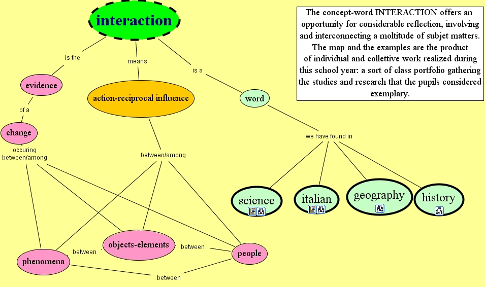 interaction, evidence, objects-elements, science, action-reciprocal influence, history, italian, phenomena, change, geography, interaction, people, word, the concept-word interaction offers an opportunity for considerable reflection, involving and interconnecting a moltitude of subjet matters. the map and the examples are the product of individual and collettive work realized during this school year a sort of class portfolio gathering the studies and research that the pupils considered exemplary.