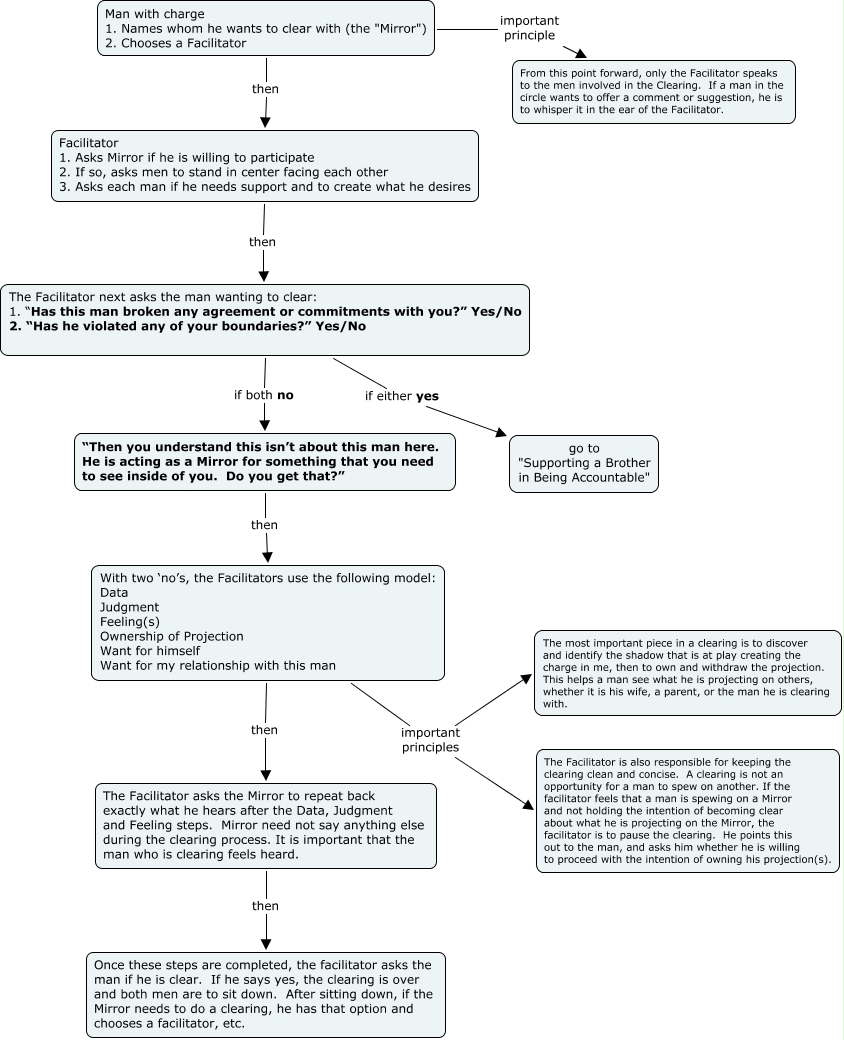 Clearing a Charge in Myself, With two ‘no’s, the Facilitators use the following model: Data Judgment Feeling(s) Ownership of Projection Want for himself Want for my relationship with this man important principles The most important piece in a clearing is to discover and identify the shadow that is at play creating the charge in me, then to own and withdraw the projection. This helps a man see what he is projecting on others, whether it is his wife, a parent, or the man he is clearing with., With two ‘no’s, the Facilitators use the following model: Data Judgment Feeling(s) Ownership of Projection Want for himself Want for my relationship with this man then The Facilitator asks the Mirror to repeat back exactly what he hears after the Data, Judgment and Feeling steps. Mirror need not say anything else during the clearing process. It is important that the man who is clearing feels heard., “Then you understand this isn’t about this man here. He is acting as a Mirror for something that you need to see inside of you. Do you get that?” then With two ‘no’s, the Facilitators use the following model: Data Judgment Feeling(s) Ownership of Projection Want for himself Want for my relationship with this man, The Facilitator next asks the man wanting to clear: 1. “Has this man broken any agreement or commitments with you?” Yes/No 2. “Has he violated any of your boundaries?” Yes/No if either yes go to "Supporting a Brother in Being Accountable", The Facilitator asks the Mirror to repeat back exactly what he hears after the Data, Judgment and Feeling steps. Mirror need not say anything else during the clearing process. It is important that the man who is clearing feels heard. then Once these steps are completed, the facilitator asks the man if he is clear. If he says yes, the clearing is over and both men are to sit down. After sitting down, if the Mirror needs to do a clearing, he has that option and chooses a facilitator, etc., Man with charge 1. Names whom he wants to clear with (the "Mirror") 2. Chooses a Facilitator then Facilitator 1. Asks Mirror if he is willing to participate 2. If so, asks men to stand in center facing each other 3. Asks each man if he needs support and to create what he desires, The Facilitator next asks the man wanting to clear: 1. “Has this man broken any agreement or commitments with you?” Yes/No 2. “Has he violated any of your boundaries?” Yes/No if both no “Then you understand this isn’t about this man here. He is acting as a Mirror for something that you need to see inside of you. Do you get that?”, Facilitator 1. Asks Mirror if he is willing to participate 2. If so, asks men to stand in center facing each other 3. Asks each man if he needs support and to create what he desires then The Facilitator next asks the man wanting to clear: 1. “Has this man broken any agreement or commitments with you?” Yes/No 2. “Has he violated any of your boundaries?” Yes/No, With two ‘no’s, the Facilitators use the following model: Data Judgment Feeling(s) Ownership of Projection Want for himself Want for my relationship with this man important principles The Facilitator is also responsible for keeping the clearing clean and concise. A clearing is not an opportunity for a man to spew on another. If the facilitator feels that a man is spewing on a Mirror and not holding the intention of becoming clear about what he is projecting on the Mirror, the facilitator is to pause the clearing. He points this out to the man, and asks him whether he is willing to proceed with the intention of owning his projection(s)., Man with charge 1. Names whom he wants to clear with (the "Mirror") 2. Chooses a Facilitator important principle From this point forward, only the Facilitator speaks to the men involved in the Clearing. If a man in the circle wants to offer a comment or suggestion, he is to whisper it in the ear of the Facilitator.