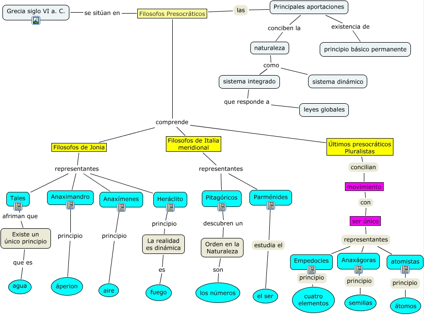 esquema presocraticos, Filosofos Presocráticos se sitúan en Grecia siglo VI a. C., Filosofos Presocráticos las Principales aportaciones, Heráclito principio La realidad es dinámica, Tales afriman que Existe un único principio, ser único representantes Empedocles, Empedocles principio cuatro elementos, La realidad es dinámica es fuego, Principales aportaciones existencia de principio básico permanente, sistema integrado que responde a leyes globales, Filosofos Presocráticos comprende Filosofos de Italia meridional