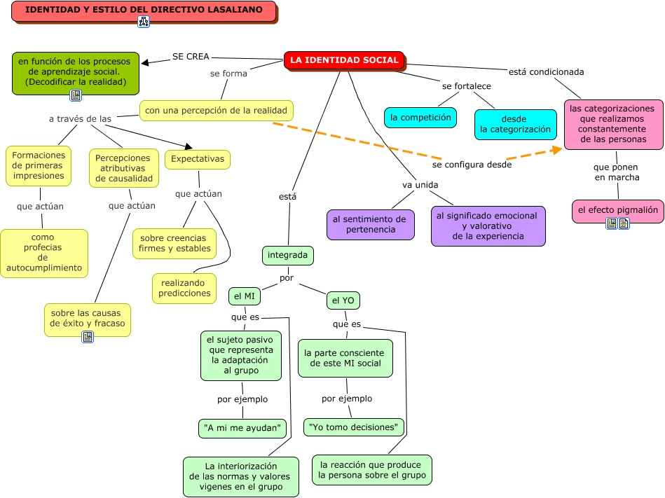 Identidad y estilo del directivo lasaliano I, con una percepción de la realidad a través de las Formaciones de primeras impresiones, el MI que es La interiorización de las normas y valores vigenes en el grupo, con una percepción de la realidad a través de las Expectativas, LA IDENTIDAD SOCIAL se forma con una percepción de la realidad, el YO que es la reacción que produce la persona sobre el grupo, LA IDENTIDAD SOCIAL SE CREA en función de los procesos de aprendizaje social. (Decodificar la realidad), con una percepción de la realidad a través de las Percepciones atributivas de causalidad, el sujeto pasivo que representa la adaptación al grupo por ejemplo "A mi me ayudan", integrada por el MI, la parte consciente de este MI social por ejemplo "Yo tomo decisiones"