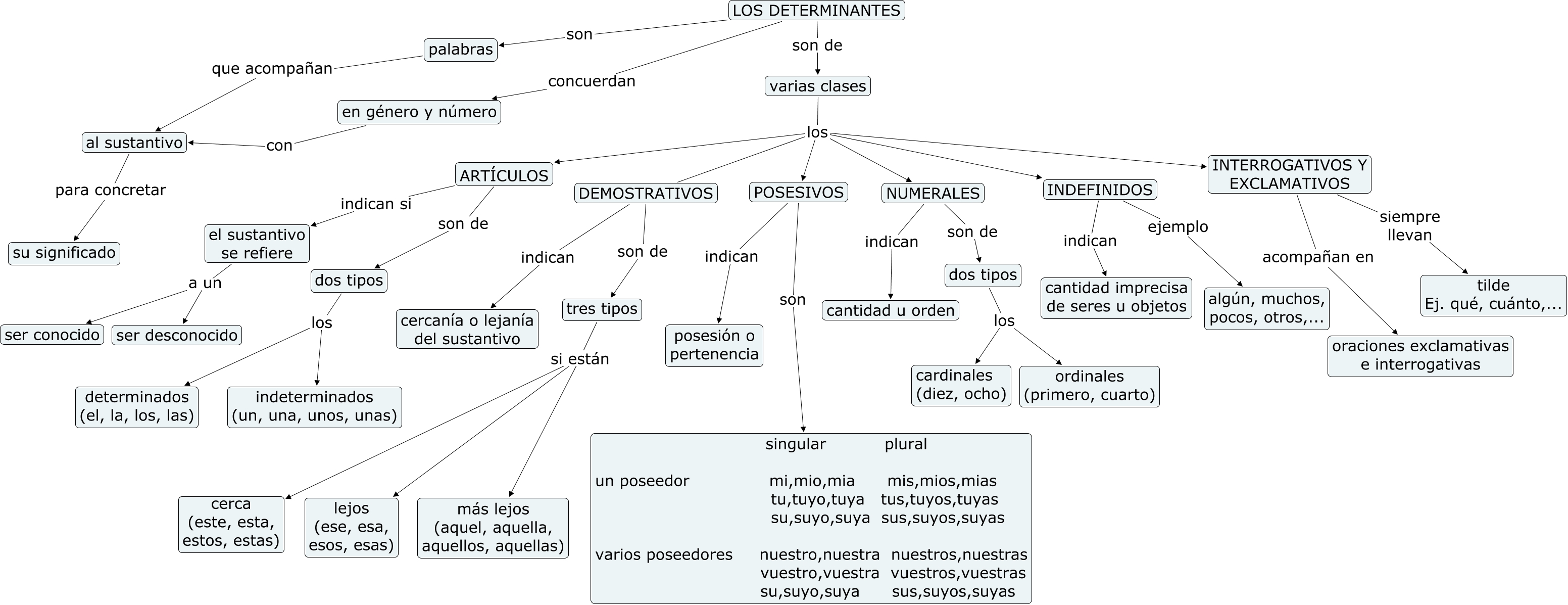 determinantes, INTERROGATIVOS Y EXCLAMATIVOS siempre llevan tilde Ej. qué, cuánto,..., POSESIVOS son singular plural un poseedor mi,mio,mia mis,mios,mias tu,tuyo,tuya tus,tuyos,tuyas su,suyo,suya sus,suyos,suyas varios poseedores nuestro,nuestra nuestros,nuestras vuestro,vuestra vuestros,vuestras su,suyo,suya sus,suyos,suyas, DEMOSTRATIVOS son de tres tipos, dos tipos los cardinales (diez, ocho), ARTÍCULOS indican si el sustantivo se refiere, varias clases los ARTÍCULOS, INDEFINIDOS ejemplo algún, muchos, pocos, otros,..., dos tipos los ordinales (primero, cuarto), palabras que acompañan al sustantivo, varias clases los DEMOSTRATIVOS