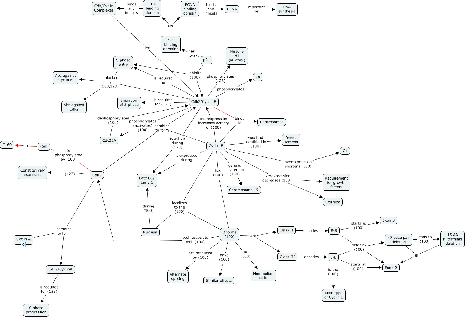 Cyclin E, p21 binding domains are PCNA binding domain, Cdk2/Cyclin E is required for S phase entry, Cyclin E overexpression decreases (100) Cell size, Cdk2/Cyclin E is blocked by (100,123) Abs against Cyclin E, 2 forms (100) in (100) Mammalian cells, 2 forms (100) are produced by (100) Alternate splicing, 15 AA N-terminal deletion is Exon 2, 2 forms (100) are Class II, E-S differ by (100) Exon 2, 47 base pair deletion is Exon 2