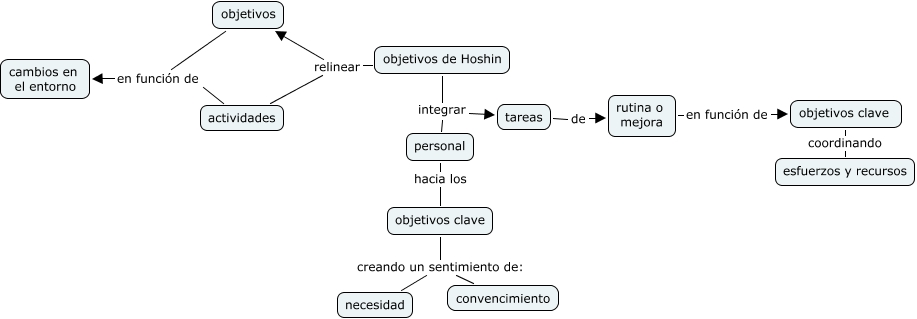 objetivos de Hoshin, objetivos de Hoshin integrar personal, objetivos clave creando un sentimiento de: convencimiento, objetivos en función de cambios en el entorno, objetivos clave coordinando esfuerzos y recursos, tareas de rutina o mejora, objetivos de Hoshin relinear actividades, actividades en función de cambios en el entorno, rutina o mejora en función de objetivos clave, objetivos de Hoshin relinear objetivos, personal hacia los objetivos clave