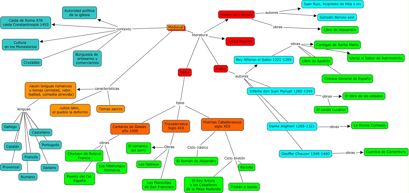 Medieval, Poemas Caballerescos siglo XIII Ciclo bretón Tristán e Isolda, Mester de Clerecía autores Gonzalo Berceo sxiii, Rey Alfonso el Sabio 1221-1284 obras Libro de Ajedrés, Rey Alfonso el Sabio 1221-1284 obras Crónica General de España, Medieval características cultos latin, el pueblo la deformo, Cantares de Gestas año 1000 obras Chanson de Roland Francia, Medieval contexto Autoridad política de la iglesia, Poemas Caballerescos siglo XIII Ciclo bretón Parsifal, Dante Alighieri 1265-1321 obras La Divina Comedia, Trovadoresca Siglo XIII Obras Las Florecillas de San Francisco