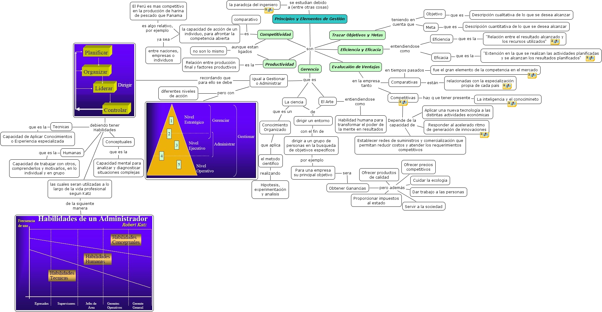 Principios y Elementos de Gestión, Productividad es la Relación entre producción final y factores productivos, Competitivas hay q ue tener presente La inteligencia y el conocimineto, Para una empresa su principal objetivo sera Obtener Ganancias, Obtener Ganancias pero además Cuidar la ecologia, debiendo tener Habilidades las cuales seran utilizadas a lo largo de la vida profesional segun Katz, Eficiencia y Eficacia entendiendose como Eficacia, Eficacia que es la "Extención en la que se realizan las actividades planificadas y se alcanzan los resultados planificados“, dirigir un entorno con el fin de dirigir a un grupo de personas en la busqueda de objetivos especificos, Obtener Ganancias pero además Proporcionar impuestos al estado, Competitividad es comparativo