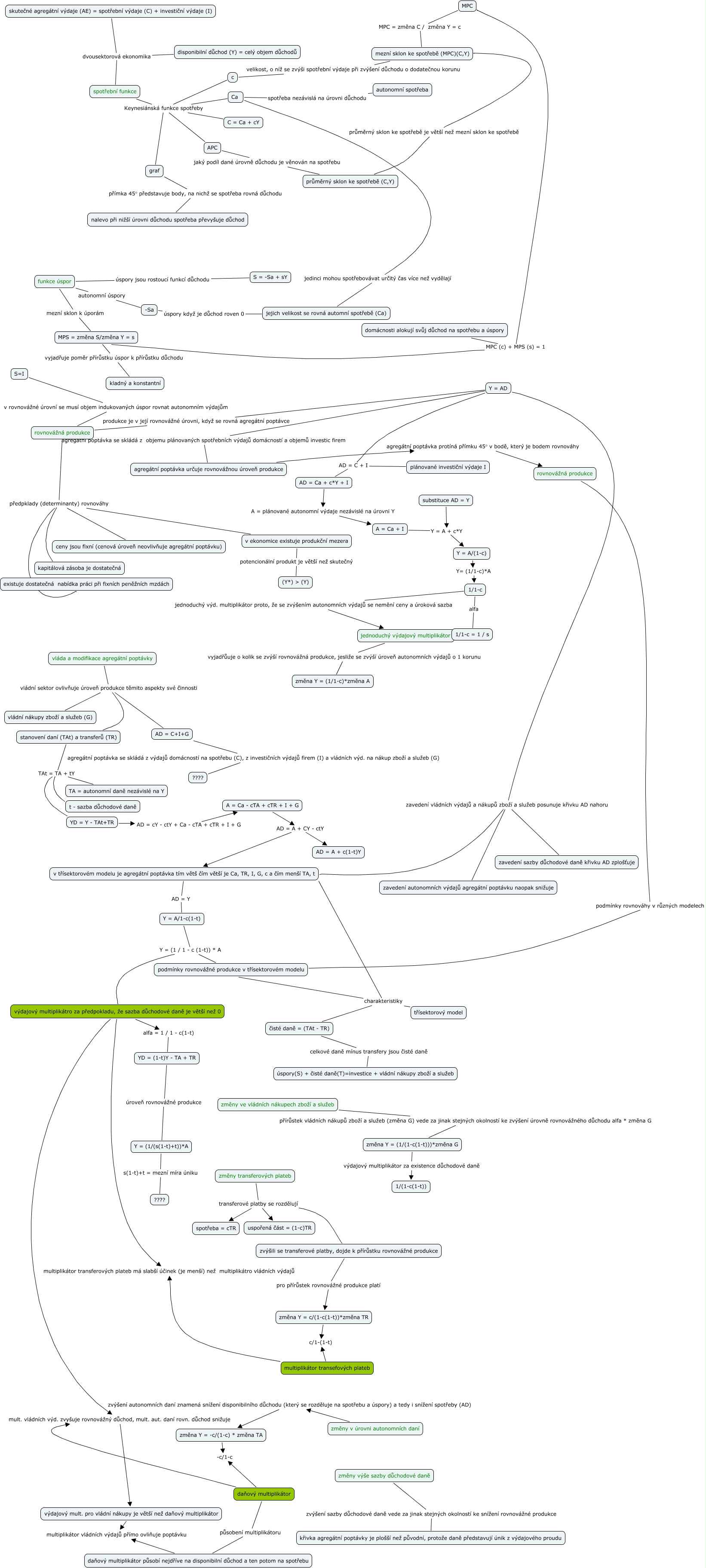 8. Určení rovnovážné produkce v dvousektorovém a třísektorovém modelu, spotřební funkce dvousektorová ekonomika skutečné agregátní výdaje (AE) = spotřební výdaje (C) + investiční výdaje (I), zvýšili se transferové platby, dojde k přírůstku rovnovážné produkce pro přírůstek rovnovážné produkce platí změna Y = c/(1-c(1-t))*změna TR, mezní sklon ke spotřebě (MPC)(C,Y) průměrný sklon ke spotřebě je větší než mezní sklon ke spotřebě průměrný sklon ke spotřebě (C,Y), 1/1-c alfa 1/1-c = 1 / s, změny výše sazby důchodové daně zvýšení sazby důchodové daně vede za jinak stejných okolností ke snížení rovnovážné produkce křivka agregátní poptávky je plošší než původní, protože daně představují únik z výdajového proudu, agregátní poptávka určuje rovnovážnou úroveň produkce agregátní poptávka protíná přímku 45° v bodě, který je bodem rovnováhy rovnovážná produkce, vláda a modifikace agregátní poptávky vládní sektor ovlivňuje úroveň produkce těmito aspekty své činnosti AD = C+I+G, rovnovážná produkce produkce je v její rovnovážné úrovni, když se rovná agregátní poptávce Y = AD, Y = AD AD = C + I AD = Ca + c*Y + I, změny v úrovni autonomních daní zvýšení autonomních daní znamená snížení disponibilního důchodu (který se rozděluje na spotřebu a úspory) a tedy i snížení spotřeby (AD) změna Y = -c/(1-c) * změna TA