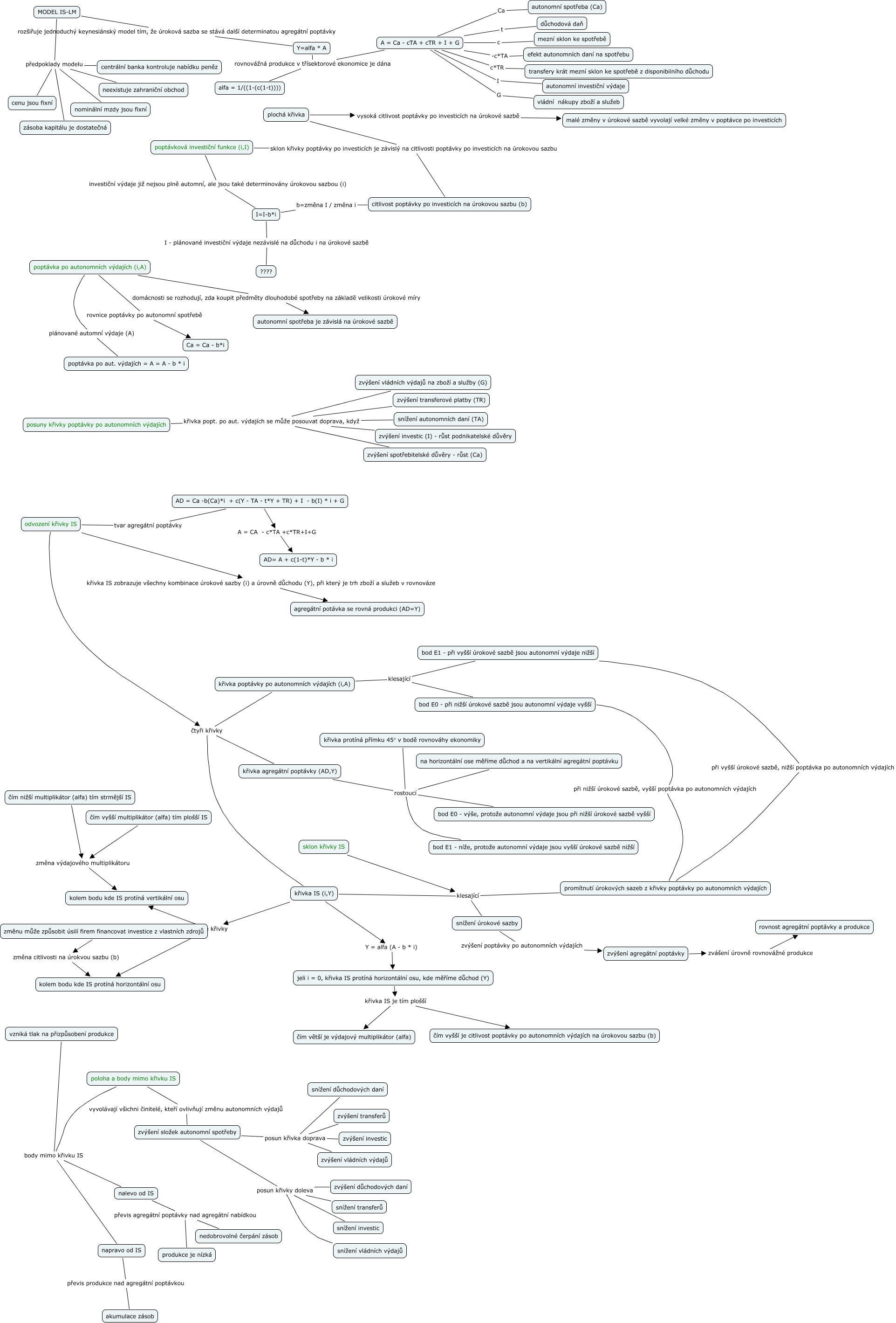 9. Model IS-LM - trh zboží a křivka IS, odvození křivky IS čtyři křivky křivka poptávky po autonomních výdajích (i,A), poloha a body mimo křivku IS body mimo křivku IS vzniká tlak na přizpůsobení produkce, křivka agregátní poptávky (AD,Y) rostoucí křivka protíná přímku 45° v bodě rovnováhy ekonomiky, poptávková investiční funkce (i,I) investiční výdaje již nejsou plně automní, ale jsou také determinovány úrokovou sazbou (i) I=I-b*i, zvýšení složek autonomní spotřeby posun křivka doprava snížení důchodových daní, sklon křivky IS klesající promítnutí úrokových sazeb z křivky poptávky po autonomních výdajích, zvýšení složek autonomní spotřeby posun křivky doleva snížení transferů, A = Ca - cTA + cTR + I + G G vládní nákupy zboží a služeb, MODEL IS-LM rozšiřuje jednoduchý keynesiánský model tím, že úroková sazba se stává další determinatou agregátní poptávky Y=alfa * A, zvýšení důchodových daní posun křivky doleva snížení transferů