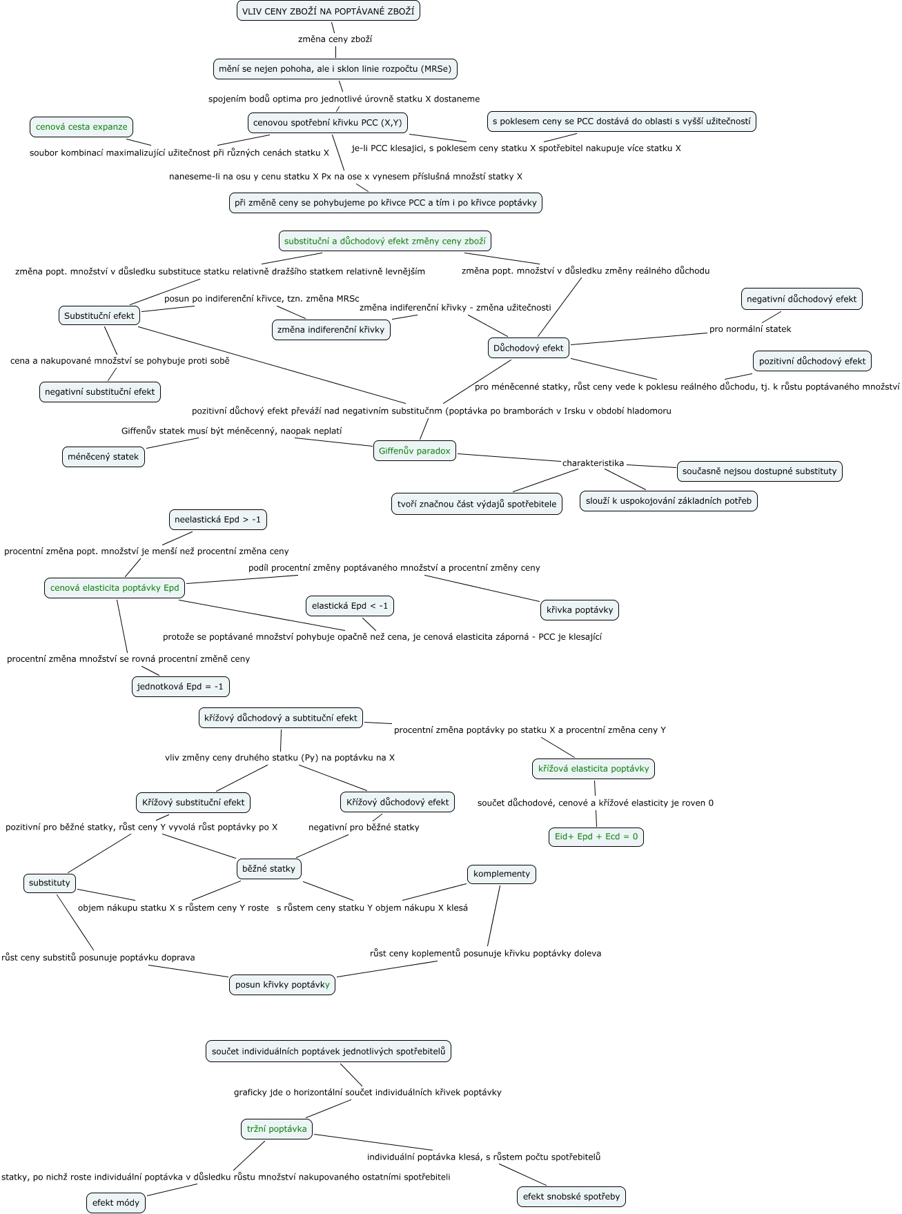 2. Vlic ceny zboží na poptávané množství, Substituční efekt posun po indiferenční křivce, tzn. změna MRSc změna indiferenční křivky, komplementy růst ceny koplementů posunuje křivku poptávky doleva posun křivky poptávky, cenovou spotřební křivku PCC (X,Y) je-li PCC klesajici, s poklesem ceny statku X spotřebitel nakupuje více statku X s poklesem ceny se PCC dostává do oblasti s vyšší užitečností, křížový důchodový a subtituční efekt vliv změny ceny druhého statku (Py) na poptávku na X Křížový důchodový efekt, Giffenův paradox charakteristika současně nejsou dostupné substituty, cenová elasticita poptávky Epd procentní změna množství se rovná procentní změně ceny jednotková Epd = -1, Giffenův paradox charakteristika tvoří značnou část výdajů spotřebitele, cenová elasticita poptávky Epd procentní změna popt. množství je menší než procentní změna ceny neelastická Epd > -1, tržní poptávka statky, po nichž roste individuální poptávka v důsledku růstu množství nakupovaného ostatními spotřebiteli efekt módy, substituční a důchodový efekt změny ceny zboží změna popt. množství v důsledku substituce statku relativně dražšího statkem relativně levnějším Substituční efekt