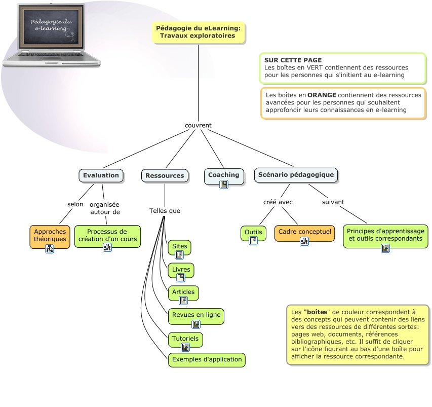 Accueil, Evaluation organisée autour de Processus de création d'un cours, Scénario pédagogique créé avec Outils, Ressources Telles que Livres, Ressources Telles que Sites, Ressources Telles que Tutoriels, Pédagogie du eLearning: Travaux exploratoires couvrent Ressources, Ressources Telles que Revues en ligne, Ressources Telles que Exemples d'application, Pédagogie du eLearning: Travaux exploratoires couvrent Scénario pédagogique, Evaluation selon Approches théoriques