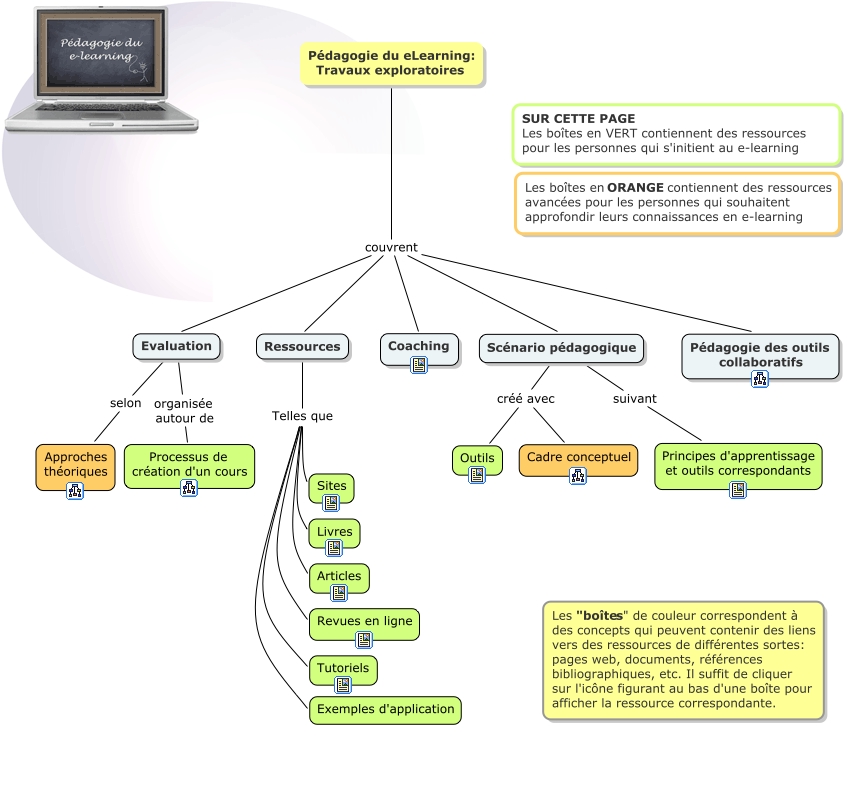 Accueil, Evaluation organisée autour de Processus de création d'un cours, Scénario pédagogique créé avec Outils, Ressources Telles que Livres, Ressources Telles que Sites, Ressources Telles que Tutoriels, Pédagogie du eLearning: Travaux exploratoires couvrent Ressources, Ressources Telles que Revues en ligne, Ressources Telles que Exemples d'application, Pédagogie du eLearning: Travaux exploratoires couvrent Scénario pédagogique, Evaluation selon Approches théoriques