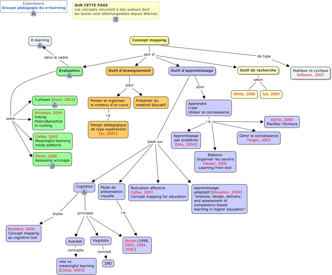 concept_mapping, Cognition styles Bruillard, 2000 Concept mapping as cognitive tool, Evaluation selon Cañas, 2003 Meaningful-learning mode patterns, Apprendre Créer Utiliser la connaissance i.e. Gérer la connaissance Tergan, 2003, Apprendre Créer Utiliser la connaissance i.e. Ojima, 2006 Planifier l'écriture, Outil d'apprentissage basé sur Cognition, Cognition principes Ausubel, Evaluation selon Akinsaya, 2004 linking theory&practice in nursing, Outil d'enseignement pour Penser et organiser le contenu d'un cours, Concept mapping de type Statique vs cyclique Safayeni, 2003, Outil d'apprentissage basé sur Mode de présentation visuelle