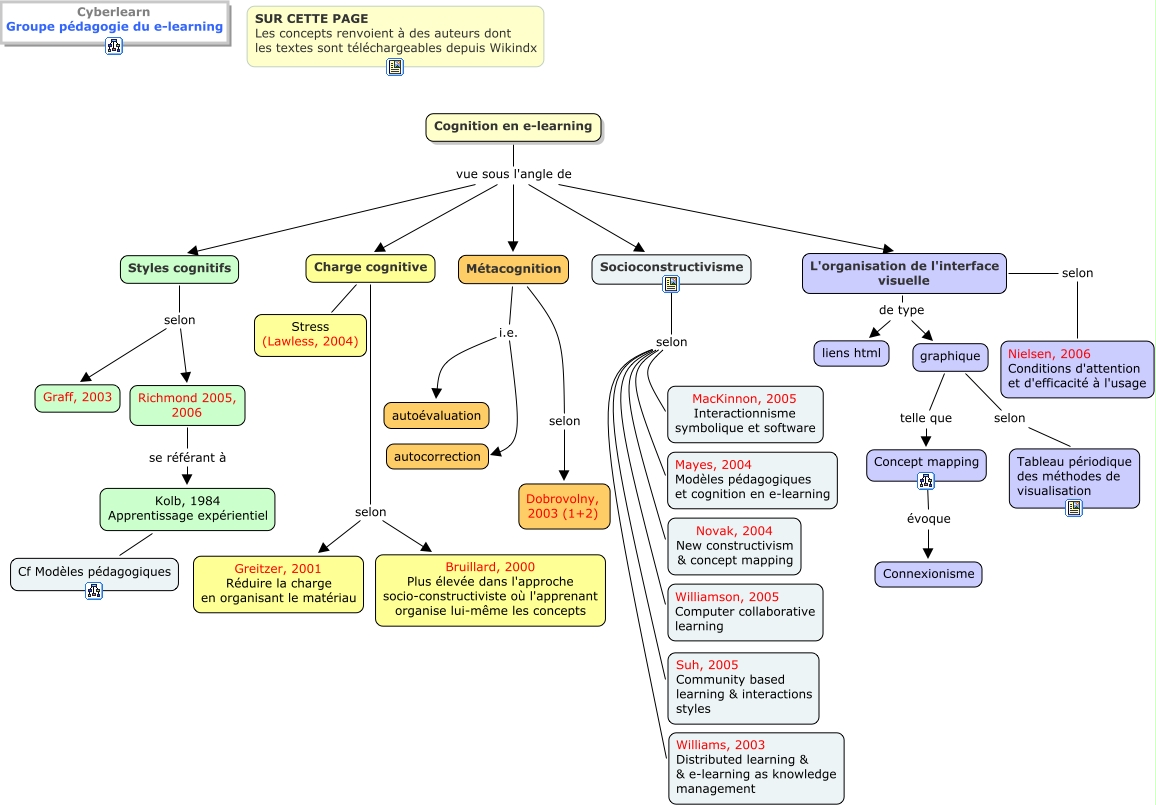 cognition_principes, graphique telle que Concept mapping, Cognition en e-learning vue sous l'angle de Charge cognitive, L'organisation de l'interface visuelle de type graphique, graphique selon Tableau périodique des méthodes de visualisation, Kolb, 1984 Apprentissage expérientiel Cf Modèles pédagogiques, Socioconstructivisme selon Novak, 2004 New constructivism & concept mapping, Socioconstructivisme selon Mayes, 2004 Modèles pédagogiques et cognition en e-learning, Cognition en e-learning vue sous l'angle de Styles cognitifs, Cognition en e-learning vue sous l'angle de L'organisation de l'interface visuelle, Charge cognitive selon Greitzer, 2001 Réduire la charge en organisant le matériau