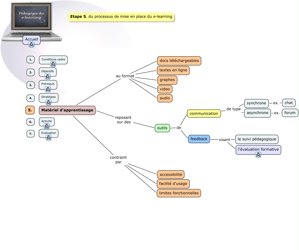 Materiel, Matériel d'apprentissage contraint par accessibilité, synchrone ex. chat, Matériel d'apprentissage au format video, Matériel d'apprentissage contraint par facilité d'usage, communication de type synchrone, Matériel d'apprentissage reposant sur des outils, Matériel d'apprentissage au format graphes, feedback visant l'évaluation formative, asynchrone ex. forum, outils de feedback