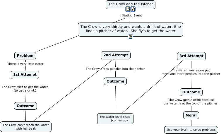 The Crow and the Pitcher, Outcome The Crow gets a drink because the water is at the top of the pitcher. Moral, Problem There is very little water 1st Attempt, Outcome ???? The water level rises (comes up), Outcome ???? The Crow can't reach the water with her beak, 3rd Attempt The water rises as we put more and more pebbles into the pitcher Outcome, The water level rises (comes up) ???? 3rd Attempt, 1st Attempt The Crow tries to get the water (to get a drink) Outcome, Moral ???? Use your brain to solve problems, The Crow and the Pitcher initiating Event Problem, 2nd Attempt The Crow drops pebbles into the pitcher Outcome