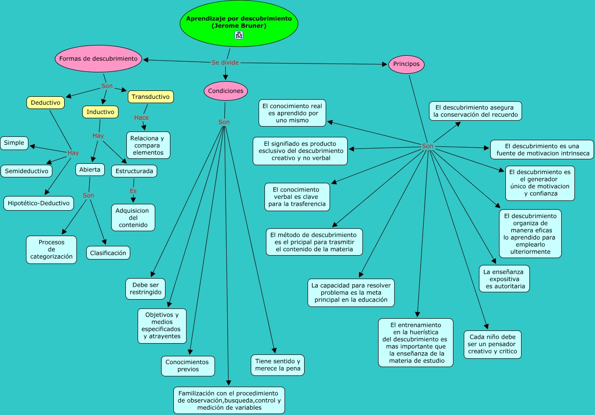 Discovery Learningescri, Principos Son El descubrimiento es una fuente de motivacion intrinseca, Principos Son El conocimiento verbal es clave para la trasferencia, Principos Son La enseñanza expositiva es autoritaria, Deductivo Hay Hipotético-Deductivo, Abierta Son Clasificación, Abierta Son Procesos de categorización, Aprendizaje por descubrimiento (Jerome Bruner) Se divide Principos, Principos Son El entrenamiento en la huerística del descubrimiento es mas importante que la enseñanza de la materia de estudio, Estructurada Es Adquisicion del contenido, Inductivo Hay Estructurada