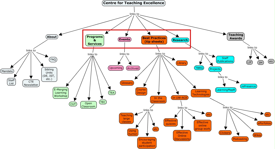 CTE-ORG1, In UW-ACE links to Effective Online Discussions, Best Practices (tip sheets) links to Course Design, Programs & Services links to TEA, Learning Technologies links to Clickers, Centre for Teaching Excellence links to Events, About links to FAQ, Research links to Staff Publications, About links to Staff List, Centre for Teaching Excellence links to Research, Centre for Teaching Excellence links to About