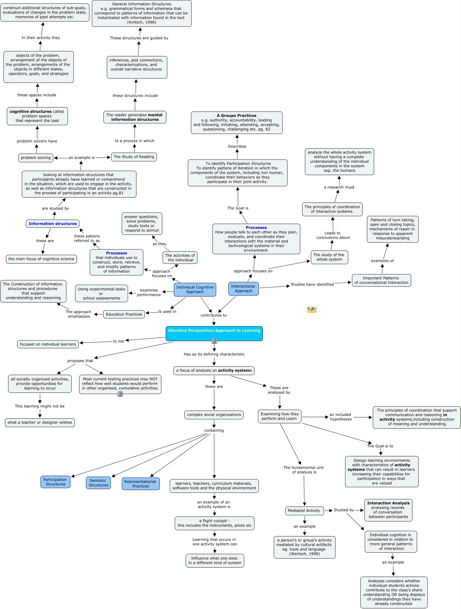 The Situative Approach - Chapter 6 - Learning in Activity v1.2, objects of the problem, arrangement of the objects of the problem, arrangements of the objects in different states, operators, goals, and strategies In their activity they construct additional structures of sub-goals, evaluations of changes in the problem state, memories of past attempts etc., Situative Perspective/Approach to Learning proposes that all socially organized activities, provide opportunities for learning to occur, Individual Cognitive Approach Is used in Education Practices, complex social organizations containing learners, teachers, curriculum materials, software tools and the physical environment, Situative Perspective/Approach to Learning Is not focused on individual learners, Education Practices The approach emphasizes The Construction of information structures and procedures that support understanding and reasoning, Individual Cognitive Approach approach focuses on Processes that individuals use to construct, store, retrieve, and modify patterns of information, Individual Cognitive Approach approach focuses on The activities of the individual, The Study of Reading Is a process in which The reader generates mental information structures, complex social organizations containing Representational Practices