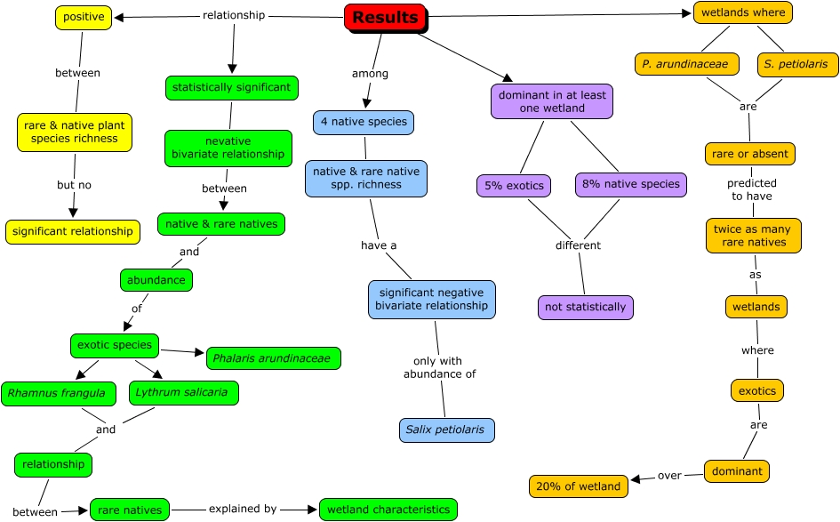 Invasive Plants Results, exotic species Rhamnus frangula, statistically significant nevative bivariate relationship, rare or absent predicted to have twice as many rare natives, dominant over 20% of wetland, rare & native plant species richness but no significant relationship, nevative bivariate relationship between native & rare natives, Results relationship statistically significant, dominant in at least one wetland 8% native species, exotic species Phalaris arundinaceae, abundance of exotic species