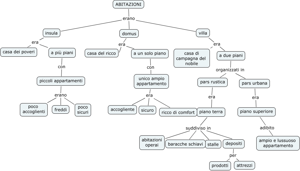 abitazioni, a due piani organizzati in pars urbana, piano superiore adibito ampio e lussuoso appartamento, villa era casa di campagna del nobile, depositi per attrezzi, piano terra suddiviso in stalle, unico ampio appartamento era sicuro, a due piani organizzati in pars rustica, insula era casa dei poveri, piano terra suddiviso in depositi, piccoli appartamenti erano poco sicuri