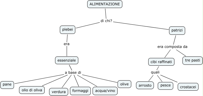 alimentazione, ALIMENTAZIONE di chi? patrizi, essenziale a base di olio di oliva, patrizi era composta da cibi raffinati, cibi raffinati quali pesce, patrizi era composta da tre pasti, cibi raffinati quali crostacei, essenziale a base di acqua/vino, plebei era essenziale, ALIMENTAZIONE di chi? plebei, essenziale a base di olive
