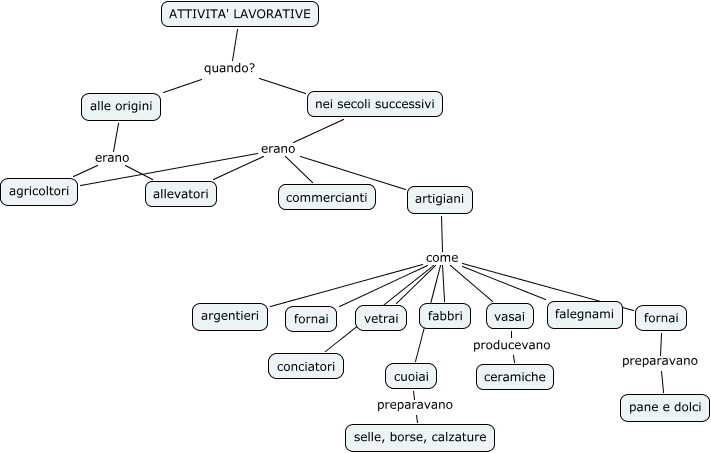 attività lavorative, artigiani come fornai, nei secoli successivi erano commercianti, alle origini erano allevatori, artigiani come fabbri, alle origini erano agricoltori, artigiani come cuoiai, artigiani come conciatori, nei secoli successivi erano artigiani, artigiani come vetrai, nei secoli successivi erano agricoltori