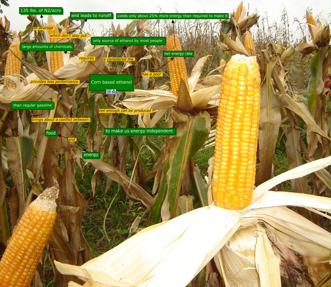 Corn Map, Corn based ethanol provides less performance than regular gasoline, Corn based ethanol not enough can be produced to make us energy independent, large amounts of chemicals which don't stay put and leads to runoff, Corn based ethanol is considered the only source of ethanol by most people, large amounts of chemicals on average 135 lbs. of N2/acre, Corn based ethanol brings about a conflict between food, energy and food, Corn based ethanol requires large amounts of chemicals, Corn based ethanol has a poor net energy rate, net energy rate yields only about 25% more energy than required to make it