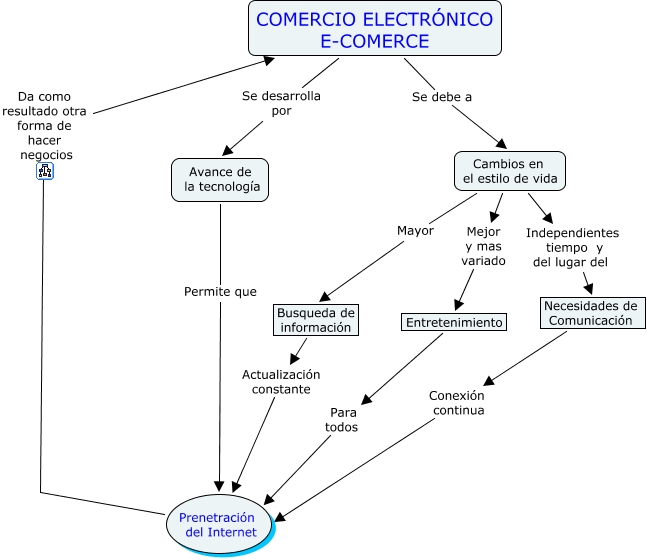 COMERCIO ELECTRONICO, Busqueda de información Actualización constante Prenetración del Internet, COMERCIO ELECTRÓNICO E-COMERCE Se debe a Cambios en el estilo de vida, Cambios en el estilo de vida Independientes tiempo y del lugar del Necesidades de Comunicación, Cambios en el estilo de vida Mayor Busqueda de información, Avance de la tecnología Permite que Prenetración del Internet, Entretenimiento Para todos Prenetración del Internet, Cambios en el estilo de vida Mejor y mas variado Entretenimiento, Prenetración del Internet Da como resultado otra forma de hacer negocios COMERCIO ELECTRÓNICO E-COMERCE, Necesidades de Comunicación Conexión continua Prenetración del Internet, COMERCIO ELECTRÓNICO E-COMERCE Se desarrolla por Avance de la tecnología