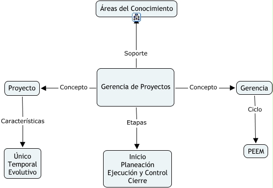 Gerencia de Proyectos, Proyecto Características Único Temporal Evolutivo, Gerencia Ciclo PEEM, Gerencia de Proyectos Concepto Proyecto, Gerencia de Proyectos Etapas Inicio Planeación Ejecución y Control Cierre, Gerencia de Proyectos Soporte Áreas del Conocimiento, Gerencia de Proyectos Concepto Gerencia